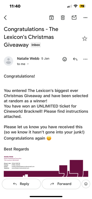 I entered the lexicon Bracknells advent competition in early December as they had some amazing Prizes up for Grabs such as shopping voucher and food experinces etc and what have you got to lose. I didn’t think much of it as I don’t win many competitions despite entering a lot over the years. I was really surprised when I got an email in January stating I had a won a £215 Cineworld more card for the year, which was their biggest prize. This feels fantastic and has started the new Year off on a high as who doesn’t love a free trip to the cinema. This will help with family trips and date nights and those visits to friends as it has taken the cost away. I hope this is a start of a lot of wins for the new year. Just goes to show you have to be in it to win it.
