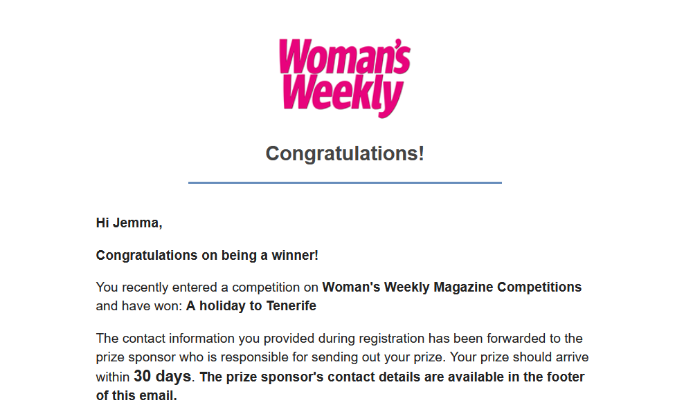 We were on our way back from a short October break in Spain, back to grey & gloomy England & depressed about the return to work the following day when all of a sudden on landing & turning my phone on I had an email to say I had in fact won - what a welcome home that was! We have organised for next July & cannot wait for some more sunshine! Thank you so much Womens Weekly!